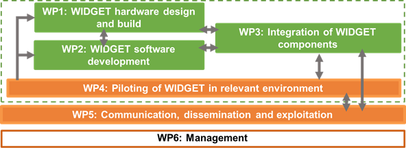 The work in WIDGET project is divided into three technology work packages fitr hardware (WP1) and software (WP2) development, that is integrated as a full working solution in WP3. The WP4 is active throughout the development of WIDGET technology, where at first the pilot cases will define the design of WIDGET technology. WP4 also verifies the results in a pilot environment set up for WIDGET first in a simulation and then on a factrory floor. The communication, dissemination and exploitation actions are developed and run in WP5 throughout the project. The work is managed in a dedicated WP7 that handles the management of risks, innovations and the project itself.